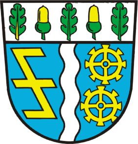 “ Unter silberner Schildhaupt, darin zwischen drei grünen Eichenblättern zwei goldene Eicheln mit grünen Fruchthülsen, in Blau ein silberner Wellenpfahl, begleitet rechts von einem linksgewendeten, schräglinksgestellten goldenen Doppelhaken mit einer Mittelsprosse und lotschnittigen Enden, links von zwei schräg übereinander gestellten, vierspeichigen goldenen Mühlrädern.“